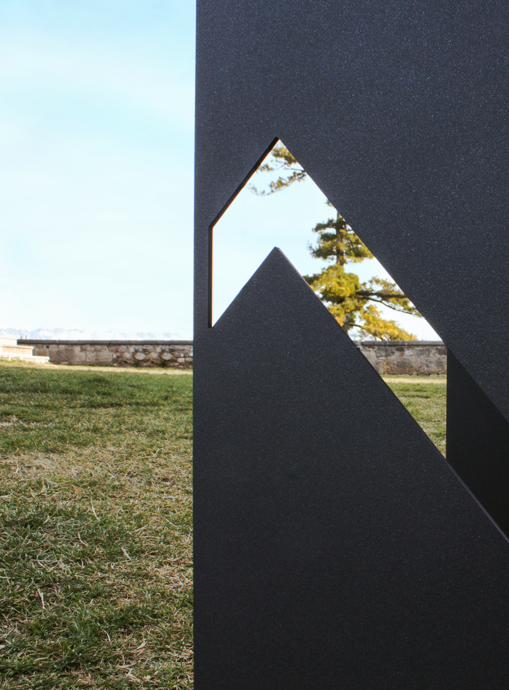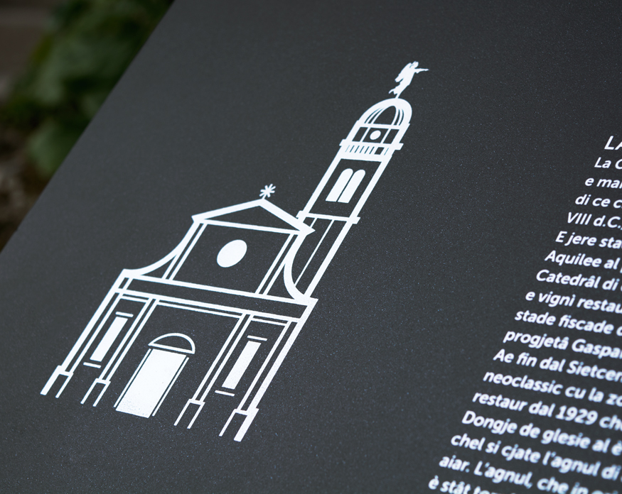 Sulla parte frontale dei totem, il taglio sagomato sulla traccia della “lambda”, simbolo della città di Udine, crea una cornice naturale che invita il visitatore a osservare e meravigliarsi delle bellezze del Castello e del panorama circostante.