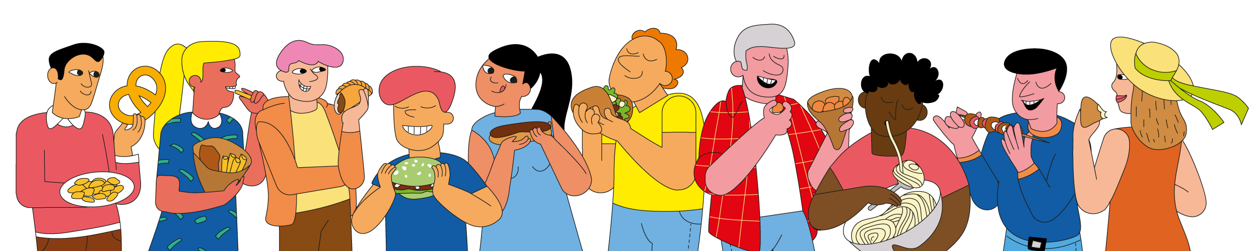 L’illustrazione raffigura una moltitudine di personaggi di diverse etnie, età e stili, ognuno colto nell’atto di gustare specialità culinarie provenienti da ogni angolo del mondo. Dai pretzel ai noodles, dalla birra artigianale al gelato, il cibo diventa strumento di dialogo tra culture. L’integrazione visiva di elementi iconici del territorio — come il campanile, il castello di Gorizia e il ponte simbolico tra Italia e Slovenia — rafforza il legame tra tradizione locale e apertura internazionale.